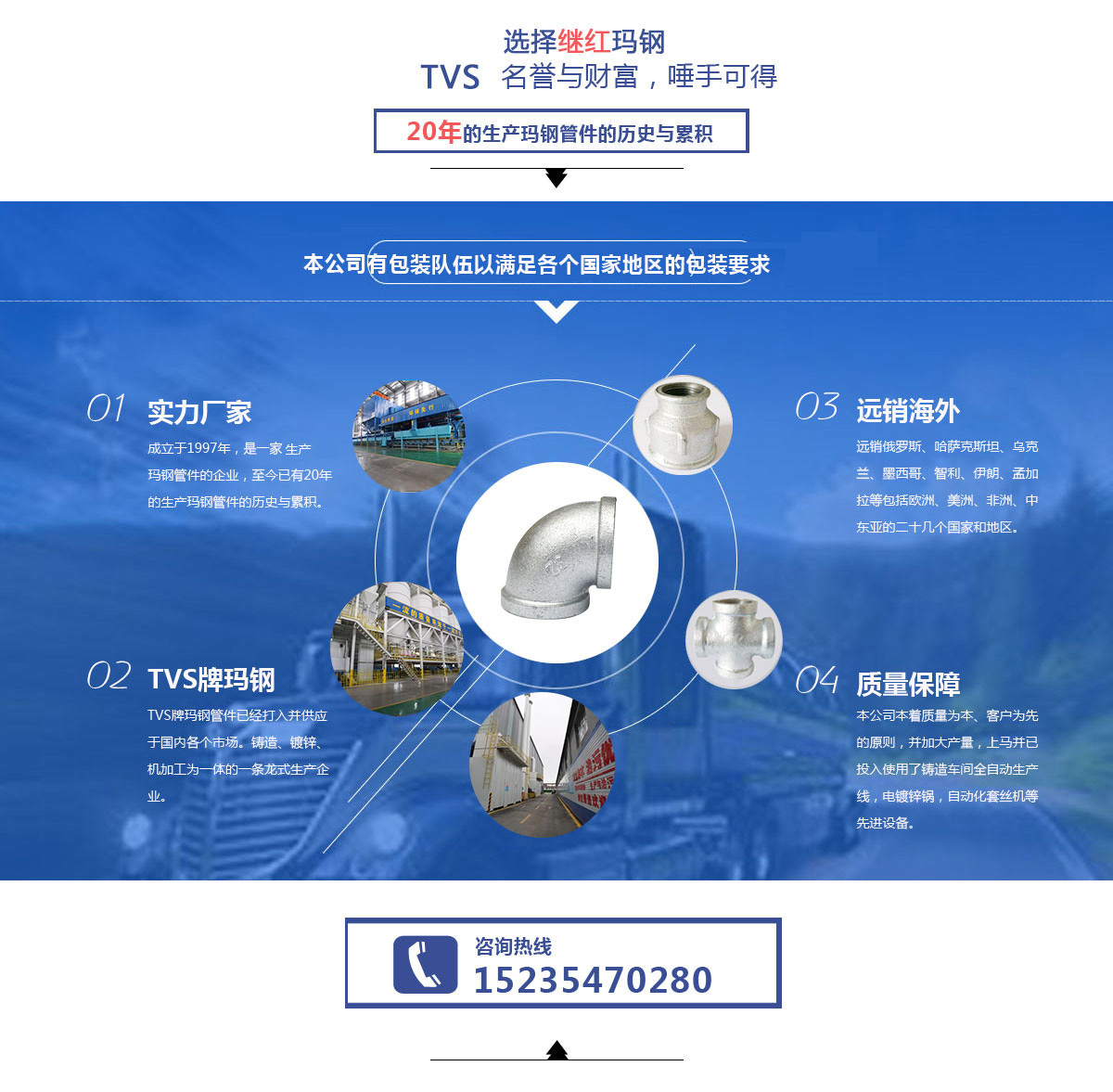 太谷繼紅瑪鋼鑄造有限責任公司座落于山西省太谷縣胡村瑪鋼工業園區,成立于1997年,是一家專業生產瑪鋼管件的企業,至今已有20年的生產瑪鋼管件的歷史與累積。其中,本公司在出口外貿瑪鋼管件方面尤其專業并具有相當大的優(yōu)勢,長年生產的德標管件、美標管件、英標管件遠銷俄羅斯、哈薩克斯坦、烏克蘭、墨西哥、智利、伊朗、孟加拉等包括歐洲、美洲、非洲、中東亞的二十幾個國家和地區。